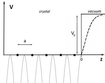 A simplified model of the crystal potential in one dimension can be sketched as shown in figure 1 .[3] In the crystal, the potential has the periodicity, a, of the lattice while close to the surface it has to somehow attain the value of the vacuum level. The step potential (solid line) shown in figure 1 is an oversimplification which is mostly convenient for simple model calculations. At a real surface the potential is influenced by image charges and the formation of surface dipoles and it rather looks as indicated by the dashed line.