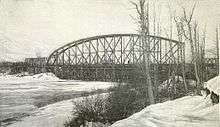 The Susitna River Bridge was the longest bridge span on the United States Government Railway in Alaska. The steel 504-ft. through-truss channel spans the Susitna River. It was completed in February, 1921. The crossing of the Susitna includes two 121-ft. combination Howe•truss flanking spans and two 70-ft. combination pony Howe-truss end spans, with 392 ft. of trestle at the southern approach and 28 ft. at the northern approach, making a total length of 1,322 ft. It is located 150 miles north of Anchorage, and 264 miles north of the terminus at Seward.[2] The bridge is on the National Register of Historic Places.