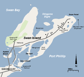 Swan Island is a 1.4 km2 sand barrier island which, with Duck Island and the Edwards Point spit, separate Swan Bay from Port Phillip in Victoria, Australia. It lies close to and north of the town of Queenscliff at the eastern end of the Bellarine Peninsula, and is an official bounded locality of the Borough of Queenscliffe.