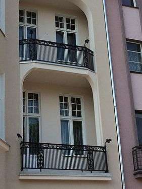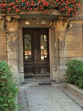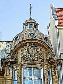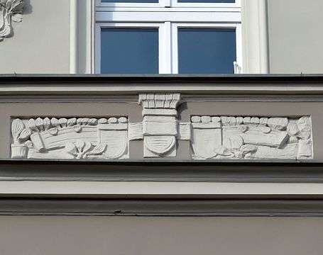 Theodore Patzwald designed there one of the more stately Neo-Baroque houses of the city.[55] The tenement displays noticeable architectural details, from bay windows topped by terrace, to wrought iron and balustrade balconies, to a huge round shape gable crowning the frontage.