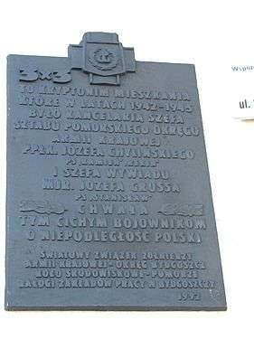 The area of Berliner Straße 2 and its surroundings was in the 1850s occupied by an iron foundry factory established in 1846 by Friedrich Eberhardt in Jakob Straße (today Grudziądzka Street).[13] In 1904, a piece of the whole plot was built for Agnes Wiechert the wife of a veterinary surgeon, as N°1a.[12] On March 1, 1923, the building housed the seta of the nascient company Eltra established by Stefan Ciszewski, an engineer from Warsaw.[14] In 1992, wall plaque has been unveiled near the porch, to commemorate World War II clandestine armed groups that fought in 1942-1945. Codenamed "3x3", the cell was led by Lieutenant Colonel and intelligence officer Józef Gruss. Józef Chyliński was arrested by communist security organs in 1945, and after two years spent in prison, he moved Canada, where he died in 1985. Józef Gruss was captured by the Gestapo but escaped in January 1945. Arrested after the war by the secret police, he was sentenced to 10 years in prison for conspiracy activities in the Armed Forces. After his release, he lived in this tenement until his death in 1969.[15]