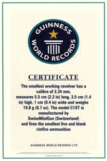 Swiss Mini Gun is recognized by Guinness World Records[2] as the world's smallest working revolver. It is a double-action revolver and has all the same features as are found on a real size gun. The manufacturer's website claims that "the manufacture of this exceptionally miniature revolver has only been made possible by exploiting the expertise and technologies of the Swiss Watch and Jewellery Industry."