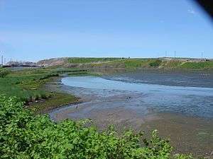 Located on the eastern shore of Sydney Harbour in the former city of Sydney (now amalgamated into the Cape Breton Regional Municipality), the Tar Ponds formed in a tidal estuary at the mouth of Muggah Creek, a freshwater stream that empties into the harbour. Throughout the 19th century, runoff from coke ovens associated with Sydney Steel Corporation's (SYSCO) now-decommissioned steel mill filled the estuary with a variety of coal-based contaminants and sludge.[2] Efforts to clean up the waterway were dogged by false starts, delays, and political controversy.[3] After extensive public consultation and technical studies, a C$400 million cleanup plan, jointly funded by the Government of Canada and Government of Nova Scotia, was announced in January 2007.[4] The cleanup was completed in 2013 with the opening of Open Hearth Park which is situated on the site of the former steel plant and has hosted events such as an Aerosmith concert in September 2014.[5]