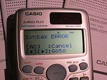 A syntax error may also occur when an invalid equation is entered into a calculator. This can be caused, for instance, by opening brackets without closing them, or less commonly, entering several decimal points in one number.