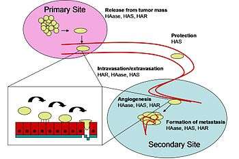Hyaluronic acid synthases (HAS) play roles in all of the stages of cancer metastasis. By producing anti-adhesive HA, HAS can allow tumor cells to release from the primary tumor mass, and if HA associates with receptors such as CD44, the activation of Rho GTPases can promote epithelial-mesenchymal transition (EMT) of the cancer cells. During the processes of intravasation or extravasation, the interaction of HAS produced HA with receptors such as CD44 or RHAMM promote the cell changes that allow for the cancer cells to infiltrate the vascular or lymphatic systems. While traveling in these systems, HA produced by HAS protects the cancer cell from physical damage. Finally, in the formation of a metastatic lesion, HAS produces HA to allow the cancer cell to interact with native cells at the secondary site and to produce a tumor for itself.[16]