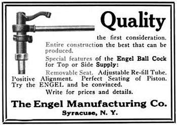 In January 1916, the Engel Manufacturing Company advertised the Engel Ball Cock "because it has been giving absolute satisfaction in actual service for the past ten years." It was made of the highest grade metal with hardware bronze seat and was the only ball cock produced with adjustable refill tube and was designed to "work equally well on high or low pressures."[25]