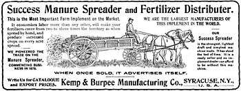 After 1880, on the second floor of the Lipe Shop, Robert Love worked on a new fertilizer spreader. The horse-drawn manure[7] spreader was produced later by the Kemp & Burpee Manufacturing Company (founded 1878),[10] which maintained a large plant in Syracuse until they were bought out by John Deere Company.[11] During 1904, they advertised their "Success Manure Spreader and Fertilizer Distributer" in a national trade journal.[10]
