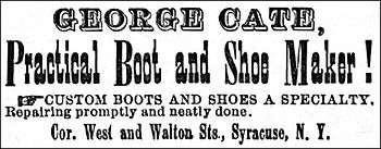 George Cate advertised in the Boyd's Syracuse City Directory in 1879 that he was a "practical boot and shoe maker" and that custom boots and shoes were his specialty. He also advertised that his shoe repair services were "promptly and neatly done." Cate's shop was located at the corner of Walton and South West streets in Syracuse and he lived at 60 South Geddes Street.[8]