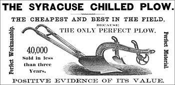 The Syracuse Chilled Plow Company, founded in 1876, was one of the first companies to lease space in the Geddes Street Lynch Building and were occupants before Charles Lipe bought the building in 1880. They built "special plows designed for the light gravelly soils in the East." Harry Wiard, descendant of Thomas Wiard, invented the chilling process in plow manufacture.[1] The company was later purchased by the Deere family (of the John Deere Company) and offered a full line of chilled plows, both walking and riding models,[7] including spring-tooth harrows, quack-grass harrows, potato machinery and grape and berry hoes.[2] By 1879, the company was operating at the corner of Marcellus and Wyoming streets.[8]