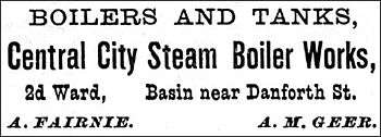 During 1884, Central City Steam Boiler Works, located in the second ward at Basin near Danforth Street was manufacturing boilers and tanks. A. Fairnie and A. M. Geer were the proprietors.[22] Onondaga Steam Boiler and Iron Works Company, who later merged with Mack Bros. Boiler and Sheet Iron Works, Inc., was established in 1888.[4] They were located at 405 Marcellus Street by 1894.[12]