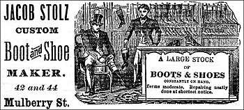 During 1884, the Jacob Stolz "Custom Boot and Shoe Maker" was located at 42 and 44 Mulberry Street. Alexander Leyns was a manufacturer of boot, shoe and "gaiter" uppers and "all kinds of fine custom boots and shoes for ladies and gents." They were located at 11 South Salina Street. Leyns widow, Laura, lived at 73-1/2 Cedar and was running the business.[22]