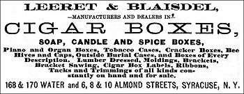 J. F. Friedel Paper Box Company was founded in 1867[4] and by 1879, there were two more box manufacturing factories in the city including J. B. Bliss at the corner of Catherine and Canal Street and Leeret & Blaisdel at 168 East Water.[8] During 1884, the company was also operating from 6, 8 and 10 Almond Street and advertised they were manufacturers and dealers in cigar boxes, soap boxes, candle boxes and spice boxes. They also manufactured piano and organ boxes, tobacco cases, cracker boxes, bee hives, outside burial cases and "boxes of every description" and touted their moldings, brackets, bracket sawing, cigar box labels, ribbons, tacks and trimmings of all kinds "constantly on hand for sale."[22]