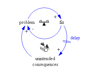 In the fixes that fail archetype, the problem is solved by some fix (a specific solution) with immediate positive effect. Nonetheless, the “side effects” of this solution turn out in the future. The best remedy seems to apply the same solution. Example: saving costs on maintenance, paying interest by other loans (with other interests)[1]