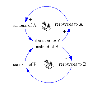 Two people or activities need the same limited resources. As one of them becomes more successful, more resources are assigned to him/it. The second one becomes less and less successful due to lacking resources, and “prove the right decision” to support the first one. Problems occur if the competition is unhealthy and interferes with the goals of the whole system. The two activities or agents might be decoupled or they should receive balanced amount of resources. Examples: two products of one company, work vs. family[1]