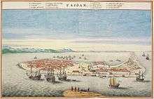 In the early 17th century, the Dutch East India Company established a commercial post at Fort Zeelandia (modern-day Anping, Tainan) on a coastal sandbar they called "Tayouan",[22] after their ethnonym for a nearby Taiwanese aboriginal tribe, written by the Dutch and Portuguese variously as Taiouwang, Tayowan, Teijoan, etc.[23] This name was also adopted into the Chinese vernacular (in particular, Hokkien, as Pe̍h-ōe-jī: Tāi-oân/Tâi-oân) as the name of the sandbar and nearby area (Tainan). The modern word "Taiwan" is derived from this usage, which is seen in various forms (大員, 大圓, 大灣, 臺員, 臺圓 and 臺窩灣) in Chinese historical records. The area of modern-day Tainan was the first permanent settlement by Western colonists and Chinese immigrants, grew to be the most important trading center, and served as the capital of the island until 1887. Use of the current Chinese name (臺灣) was formalized as early as 1684 with the establishment of Taiwan Prefecture. Through its rapid development, the entire Formosan mainland eventually became known as "Taiwan".[24][25][26][27]