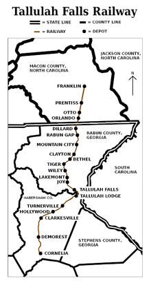 The Tallulah Falls Railway, also known as the Tallulah Falls Railroad, "The TF" and "TF & Huckleberry," was a railroad based in Tallulah Falls, Georgia, U.S. which ran from Cornelia, Georgia to Franklin, North Carolina. It was commissioned by the Georgia General Assembly on January 27, 1854 and conducted its final run on March 25, 1961.
