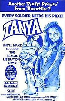 Tanya is a low-budget 1976 comedy film directed by Nate Rodgers and loosely based on the experiences of Patricia Hearst. The lead character, Charlotte Kane, is 20-year-old heiress of a newspaper mogul. She is kidnapped by five sex-crazed pseudo-relovutionaries who call themselves "The Symphonic Liberation Army" (a parody of the Symbionese Liberation Army). Charlotte is quickly converted to their cause and changes her name to Tanya.