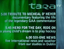 Tara Television had an exclusive option to purchase the majority of RTÉ's programming, and this accounted for about 80% of the total programmes broadcast by the station, with the remainder being filled by programmes purchased from other networks. It mainly broadcast news bulletins and current affairs programming, as well as extensive coverage of Irish sport, in particular, GAA. RTÉ made sure that from 16 July 2001, Tara Television was blocked to Irish Sky subscribers as they feared loss of advertising revenue.[1]