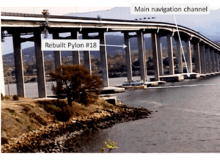 Specialists in marine engineering undertook an extensive investigation to locate bridge debris. This survey took a number of months to complete, and parts of the bridge weighing up to 500 tons were accurately located using equipment developed by the University of Tasmania and the Public Works Department. Maunsell and Partners were appointed consultants for the rebuilding project. The firm John Holland was awarded the construction contract.[11] Engineers decided not to replace pier 19 as there was too much debris on the site.[12] The Tasman Bridge was re-opened on 8 October 1977, nearly three years after its collapse.[1] The annual expenditures on the Tasman Bridge reconstruction were $1.7 m in 1974–75; $12.3 m in 1975–76; $13.2 m in 1976–77 and $6.1m in 1977–78.[13]