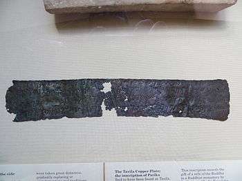 The copper plate is written in the Kharosthi script (a script derived from Aramaic). It relates the dedication of a relic of the Buddha Shakyamuni (Pali: śakamuni, literally "Master of the Shakas") to a Buddhist monastery by the Indo-Scythian (Pali: "śaka") ruler Patika Kusulaka, son of Liaka Kusulaka, satrap of Chukhsa, near Taxila.