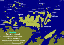 Taymyr Island is one of the islands of the coastal area of the Nordenskiöld Archipelago. The shores of Taymyr Island and some of its larger neighboring islands, such as Nansena, Bonevi and Pilota Makhotkina, are deeply indented, with many crooked inlets. The sounds between this island and neighboring islands are also somewhat labyrinthic. Geologically all these coastal islands are a continuation of the Nordenskiöld Archipelago which lies further north.[1] Hovgaard Island, the closest island of the Nordenskiöld Archipelago lies 10.8 kilometers (6.7 mi) northwest of the NW point of Taymyr Island across the Matisen Strait.[2]