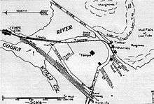 The contractors for the construction of the first 23-mile [37 km] section of the Illawarra Railway arranged with timber mills in the Port Stephens and Manning River districts for the supply of sleepers and other timber necessary for the construction. This material was brought down by sea to Botany Bay in schooners and small coastal steamers. The vessels anchored off the entrance to Cooks River and discharged their cargoes on to flat-bottomed punts. Tugs towed the laden punts along the channels of the river to the head of navigation at the Tempe Dam, near the present Princes Highway bridge. On the river bank, immediately to the south of the dam, the contractors erected three wharves where the timber was unloaded and placed on small 4-wheeled railway trucks for conveyance by horse teams, over a temporary tramway,[8] to the company's depot which was established about midway between St Peters and Sydenham railway stations. A large amount of material of all descriptions, including steelwork, for the railway bridge at Como, was also taken over the tramway from the depot to the wharves, where it was loaded on to a small paddle steamer for conveyance to Como via Botany Bay and Georges River.