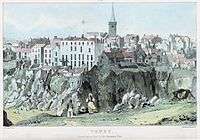 Paxton also took in "tour" developments in the area, as required by rich Victorian tourists. This included the discovery of a chalybeate spring in his own park at Middleton Hall, and coaching inns from Swansea to Narberth. He also built Paxton's Tower, in memorial to Lord Nelson whom he had met in 1802 when mayor of Carmarthen.[5] Paxton's efforts to revive the town succeeded, and even when victory at the Battle of Trafalgar reopened Europe, the growth of Victorian Tenby was inevitable. Through both the Georgian and Victorian eras Tenby was renowned as a health resort and centre for botanical and geological study.[6] With many features of the town being constructed to provide areas for healthy seaside walks, due to the walkways being built to accommodate Victorian nannies pushing prams, many of the beaches today still retain good disabled access. In 1856 writer Mary Ann Evans (pen-name George Eliot) accompanied George Henry Lewes to Tenby to gather materials for his work Seaside Studies published in 1858.