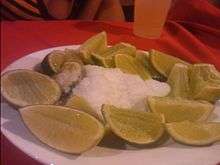 Outside Mexico, a single shot of tequila is often served with salt and a slice of lime. This is called tequila cruda and is sometimes referred to as "training wheels", "lick-sip-suck", or "lick-shoot-suck" (referring to the way in which the combination of ingredients is imbibed). The drinkers moisten the back of their hands below the index finger (usually by licking) and pour on the salt. Then the salt is licked off the hand, the tequila is drunk, and the fruit slice is quickly bitten. Groups of drinkers often do this simultaneously. Drinking tequila in this way is often erroneously called a Tequila Slammer,[44] which is in fact a mix of tequila and carbonated drink. Though the traditional Mexican shot is tequila by itself, lime is the fruit of choice when a chaser must be used.[45] The salt is believed to lessen the "burn" of the tequila and the sour fruit balances and enhances the flavor. In Germany and some other countries, tequila oro (gold) is often consumed with cinnamon on a slice of orange after, while tequila blanco (white) is consumed with salt and lime. Finally, as with other popular liquors, a number of shot-related drinking games and "stunt" drinks are used, such as body shots.