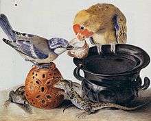 Parrot, Blue Tit, Two Lizards, and Vases, 1706