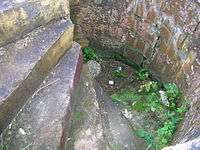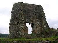 The small, irregular, octangular 14th century vaulted tower has a splayed base[4][5] and is constructed of courses of square ashlar masonry,[6] 6 m (20 ft) high, with walls 2.0m thick, is the earliest part of the structure, together with the wide wall at the north-west. The tower was vaulted, with three ribs, and an entrance from the courtyard via a narrow passage leading to a partly surviving wheel-stair.[4] The remains of outbuildings lie to the north and a well was recorded within the keep; a sizeable courtyard lay within the complex.[7] The remains have seen some restoration[8] and the lines of excavation trenches are apparent. The whereabouts of the records of the late 19th century excavations is not known for certain.[9]