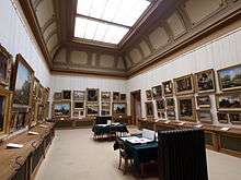 Teylers Foundation started collecting contemporary Dutch paintings in 1821. The paintings were either commissioned directly from the painters or acquired at exhibitions. The first room used to display paintings was the room that is today used as a print cabinet and was added to the Oval room in 1824 along with the library room upstairs.[1] The lack of light quickly made viewing the paintings there unpopular and it was used mostly for lectures and experiments. According to the archives, the expansion was done by the foundation's own building crew that was on hand for day-to-day improvements. The gallery had large curved windows like the Oval room, which have since been closed. An impression of the original windows can be seen in a charcoal sketch by Johan Conrad Greive in 1862. The collection today is mostly based on that same group of paintings. The gallery also contains a table that was used to hold the portfolios of drawings and a similar portfolio with Rembrandt and Michelangelo reproductions can still be consulted (the actual drawings are held in special storage).