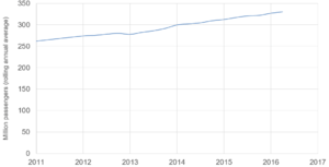 Passenger numbers on Govia Thameslink Railway (which also includes Southern and Gatwick Express) have risen from 262 million annually in 2010/11 to 327 million annually in 2015/16.[29]