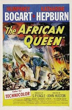 The African Queen is a 1951 British-American adventure film adapted from the 1935 novel of the same name by C. S. Forester.[4] The film was directed by John Huston and produced by Sam Spiegel[5] and John Woolf. The screenplay was adapted by James Agee, John Huston, John Collier and Peter Viertel. It was photographed in Technicolor by Jack Cardiff and had a music score by Allan Gray. The film stars Humphrey Bogart (who won the Academy Award for Best Actor – his only Oscar), and Katharine Hepburn with Robert Morley, Peter Bull, Walter Gotell, Richard Marner and Theodore Bikel.[6]