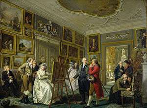 The Art Gallery of Jan Gildemeester Jansz is a painting created by the Dutch painter Adriaan de Lelie in 1794-95. It is part of the collection of the Rijksmuseum Amsterdam, 63.7 cm wide and 85.7 cm high, executed in oil paint on panel. It depicts the art collector Jan Gildemeester Jansz (or Jan Jansz. Gildemeester) in the midst of his large collection of paintings, showing them to friends.