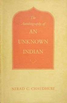 The Autobiography of an Unknown Indian is the 1951 autobiography of Nirad C. Chaudhuri, an Indian writer.[1][2] Written when he was around 50, it records his life from his birth in 1897 in Kishorganj, a small town in present-day Bangladesh. The book relates his mental and intellectual development, his life and growth in Calcutta, his observations of vanishing landmarks, the connotation of this is dual—changing Indian situation and historical forces that was making exit of British from India an imminent affair.
