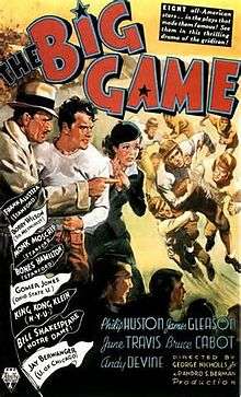 The Big Game is a 1936 American sports drama film directed by George Nicholls, Jr. and produced by RKO Radio Pictures, which released the film on October 9, 1936. The screenplay was written by Irwin Shaw, adapted from the 1936 novel of the same name by Francis Wallace. The film stars Philip Huston, James Gleason, June Travis, Bruce Cabot and Andy Devine.