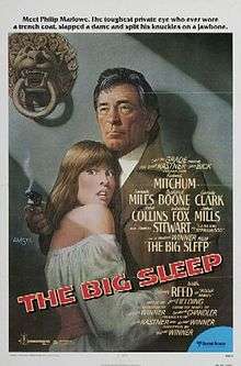 The Big Sleep is a 1978 film, the second film version of Raymond Chandler's 1939 novel of the same name. The picture was directed by Michael Winner and stars Robert Mitchum in his second feature film portrayal of the detective Philip Marlowe. The cast includes Sarah Miles, Candy Clark, Joan Collins, and Oliver Reed, also featuring James Stewart as General Sternwood.[1]