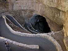 The parking terraces were designed by A.W. Burney of Yellowstone National Park's engineering division. Construction was supervised by park superintendent Boles, who was also an engineer. The terraces are designed to fit the local environment with rustic stone walls and landscaping with native plants. A cactus garden was established at the end of the parking area, designed by Park Service architect W.G. Carnes, incorporating a prehistoric mescal pit. A switchback trail leads to the natural cave entrance, with other footpaths and terraces to the residences and the administration building.[2]