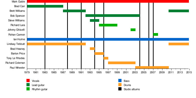 Choirboys formed in the Northern Beaches area of Sydney as a hard rock pub band in 1979.[1] Original members were Brad Carr on lead guitar, Mark Gable on vocals, Ian Hulme on bass guitar and Lindsay Tebbutt on drums.[2]