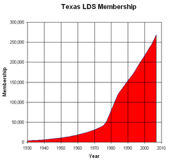 As of year-end 2010, The Church of Jesus Christ of Latter-day Saints (LDS Church) reported 296,141 members, 49 stakes,[1] three districts,[1] 557 congregations (413 wards[2] and 105 branches[2]), eight missions, and four temples in Texas.[3]
