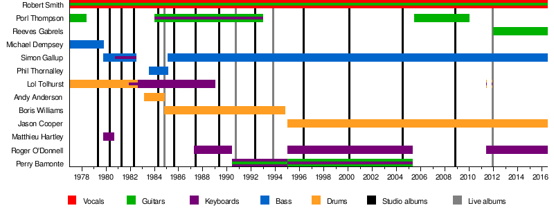 The following is the history of The Cure's personnel and various lineups from 1976 to 2012, going back to the English rock group's origins as Malice and Easy Cure, and also including guest musicians, studio personnel, and side projects.