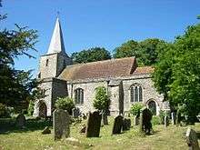 Other locations in Pluckley village itself were used extensively; the Black Horse pub in The Street was renamed the Hare and Hounds and used as the Larkins' local. Church Gate Cottage and Fig Tree Cottage in The Street served as Edith Pilchester's and The Brigadier's homes respectively. Pluckley primary school, also in The Street, served as the village hall. The butcher's shop also featured, and the Post Office (dressed as the grocer's). Church scenes were filmed at St Nicholas Church in the village.[6]