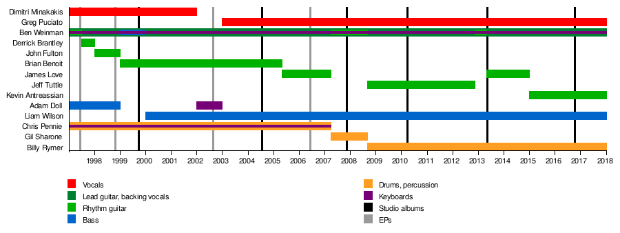 The experimental metal band The Dillinger Escape Plan has undergone numerous lineup changes throughout the band's existence. Guitarist Ben Weinman is the only remaining founding member, though bassist Liam Wilson and vocalist Greg Puciato have now been with the band for most of its existence.