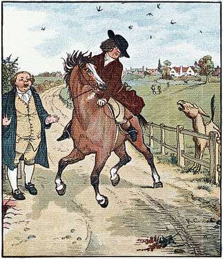The Diverting History of John Gilpin Shewing how he went Farther than he intended, and came safe Home again is a comic ballad by William Cowper about John Gilpin, written in 1782. The ballad concerns a draper called John Gilpin who rides a runaway horse. Cowper heard the story from Lady Anna Austen at a time of severe depression, and it cheered him up so much that he put it into verse.[1] The poem was published anonymously in the Public Advertiser in 1782, and then published with The Task in 1785.[2] It was very popular, to the extent that "pirate copies were being sold all across the country, together with Gilpin books and toys."[1]