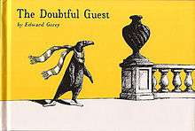 The Doubtful Guest is a short, illustrated book by Edward Gorey, first published by Doubleday in 1957. It is the third of Gorey's books and shares with his others a sense of the absurd, meticulous cross-hatching, and a seemingly-Edwardian setting. The book begins with the sudden appearance of a strange, penguin-like creature in a turn-of-the-century manor house. An aristocratic family struggles to coexist with the creature, who is by turns despondent and mischievous. By the final page, the guest has stayed for seventeen years, and shows "no intention of going away".
