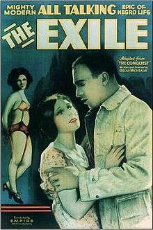 The Exile is a 1931 American film by Oscar Micheaux with the co-direction of the Dances and Ensemble by Leonard Harper. A drama–romance of the race film genre, it was Micheaux's first feature-length talkie, and the first African American talkie.[1][2] Adapted from Micheaux's first novel, The Conquest (1913), it has some autobiographical elements: like the film's central character Jean Baptiste (played by Stanley Morrell), Micheaux spent several years as a cattle rancher in an otherwise all-white area of South Dakota.