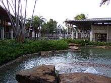 The Falls opened in 1980 as an upscale, open-air plaza. As its name implies, the center is designed around a lushly-landscaped man-made lagoon featuring numerous pools, waterfalls and bridges accented with modern sculpture pieces and decorative lighting. In 1984 the first anchor store, Bloomingdale's, was added, bringing the center to 450,000 ft². Bloomingdale's closed temporarily in September 1992 after the store was severely damaged by Hurricane Andrew, but it later re-opened in late 1993. Macy's opened a store in 1996 during an expansion that doubled the size of the shopping center. The center features an iconic tower sign on the southwestern corner of South Dixie Highway and S.W. 136th Street (Howard Drive). The success of the center has led to the surrounding Howard, Briar Bay and Colonial Palms neighborhoods to be encompassed by the generic "The Falls" name.