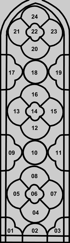 The Good Samaritan window of the Cathedral Notre-Dame de Chartres is located in the south aisle of the nave (#44, see floorplan). Designed to be read from bottom to top, it presents twenty-four separate but interconnected panels. The window presents three medallion clusters (quatrefoils) supported by a demi-cluster horizontal base and interspersed with two lateral demi-medallion clusters.