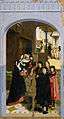 The Holy Kinship shows the Virgin and Child in the left center with Saint Elizabeth and John the Baptist slightly more prominently positioned center right.[2] The "kinship" members have been further identified as Saint Anne with a book on the left with her husband Joachim behind her and behind him Saint Joseph holding a lily towards his wife as a gesture of the immaculate conception. Three young cousins of the infants, the later disciples Simon, Jacob and John, pour wine into a chalice in the centre of the painting which is a reference to the Eucharist, and beyond them a sculpture of Abraham's sacrifice of Isaac on the altar represents God's sacrifice of Jesus. A young Judas stands lighting the candles of the choir gate. In the doorways of the choir gate stand the other two former husbands of Saint Anne, the fathers of the other two Marias who are positioned behind St. Elisabeth.