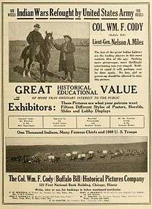 The Indian Wars Refought is a 1914 American drama silent film that depicts several historical battles of The Indian Wars. The film was directed by Theodore Wharton and stars William F. Cody, Nelson Appleton Miles and Charles King, all of whom participated in the actual battles depicted in the movie. The feature was produced by the Buffalo Bill Historical Picture Company and Essanay Film Mfg. Company. The film was released in August 1914, but according to modern sources, it only played in Denver and New York City because of pressure from the government, which disapproved of its content because it showed the Indians in a somewhat favorable light.[1][2] It is now considered a lost film.[3]